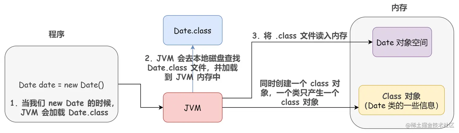 首先 JVM 会将你的代码编译成一个 .class 字节码文件,然后被类加载器(Class Loader)加载进 JVM 的内存中,同时会创建一个 Date 类的 Class 对象存到堆中(注意这个不是 new 出来的对象,而是类的类型对象)。JVM 在创建 Date 对象前,会先检查其类是否加载,寻找类对应的 Class 对象,若加载好,则为其分配内存,然后再进行初始化 new Date()。