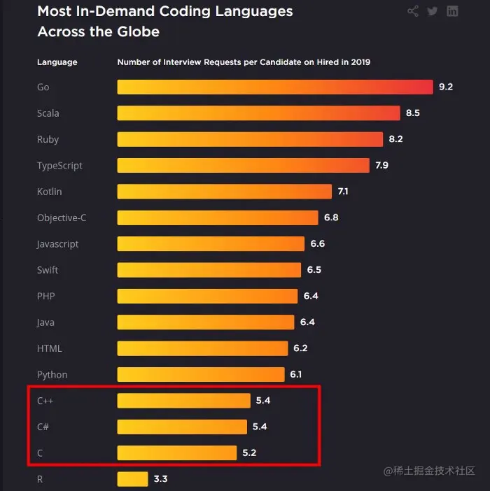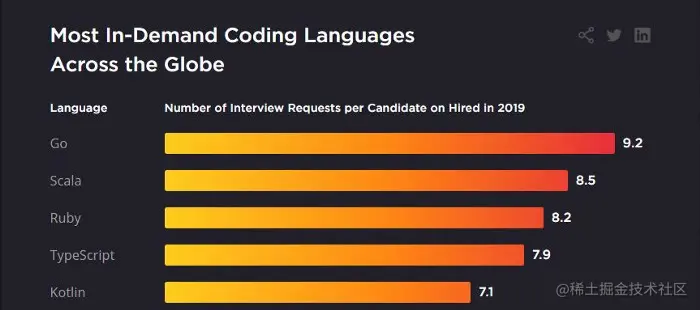 根据 Hired 的评分,Kotlin是世界上五种最受欢迎的编程语言之一。它比 Java 和 Python 排名还高。在其领域内仅低于于 Go 和 Scala。