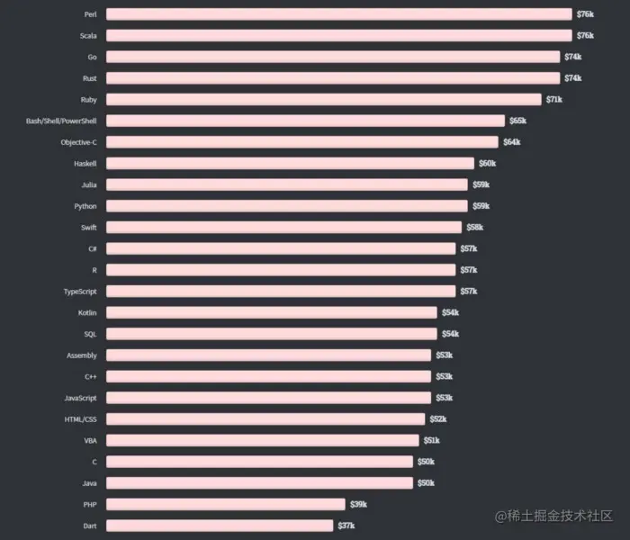 另外, 选择对编程语言并对其有深入的理解可以帮助大家在某一领域找到更好的工作。从编程语言和薪资的对比列表中我们可以看出去年拿钱最高的编程语言。