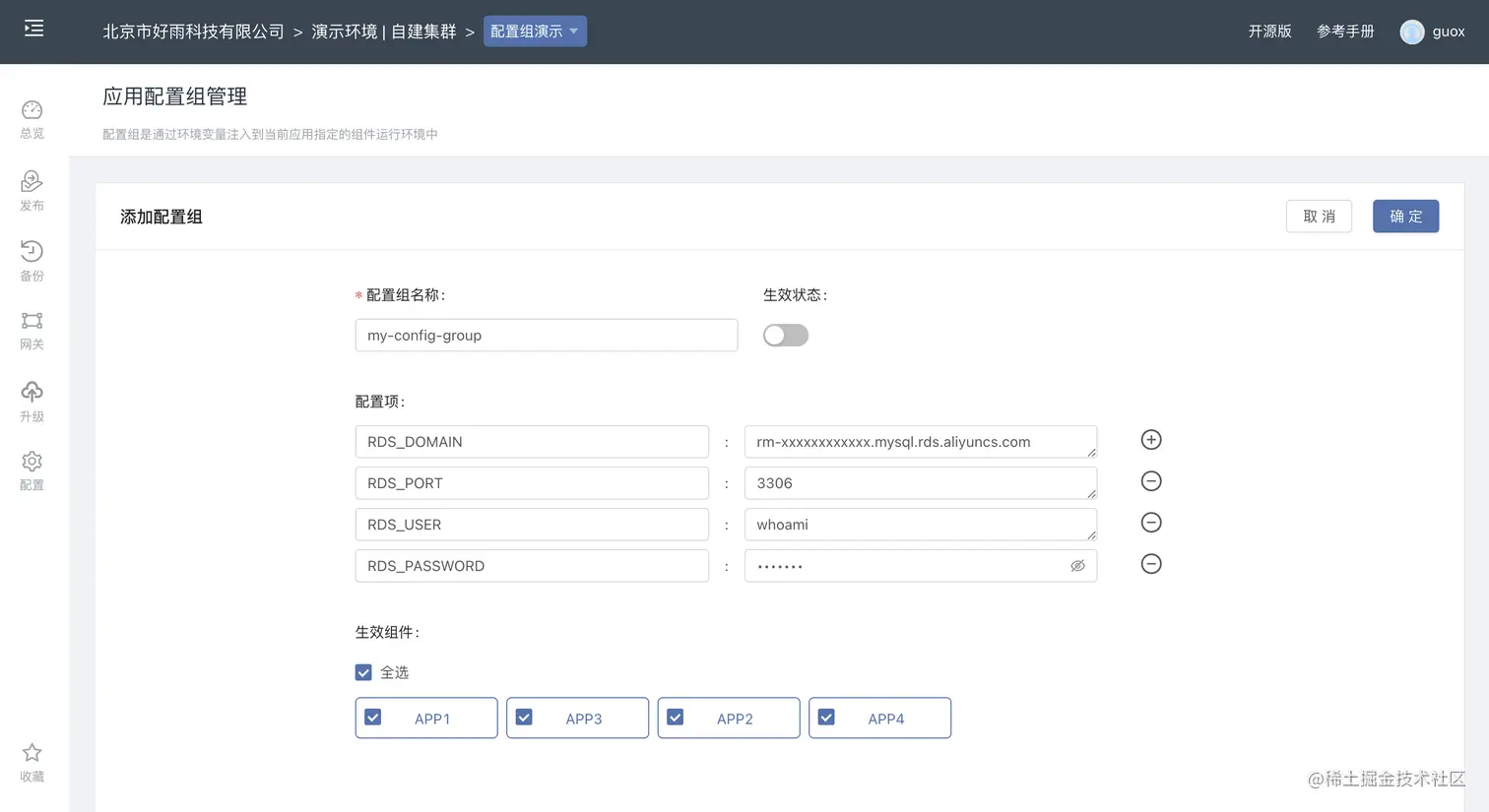 云原生应用推荐使用环境变量进行配置管理。因此我们经常需要在同一个应用的多个组件中添加相同的配置。比如一个应用下有多个组件使用同一个 Oracle 数据库,我们通过环境变量来配置 Oracle 数据库的连接信息。管理和配置需要做很多重复的事。借助应用配置组即可将配置信息在应用级统一管理,批量更改生效,大大降低开发者的操作次数。