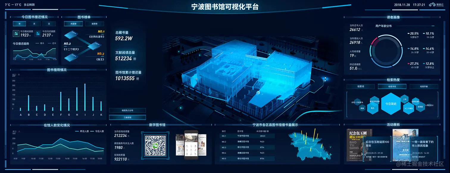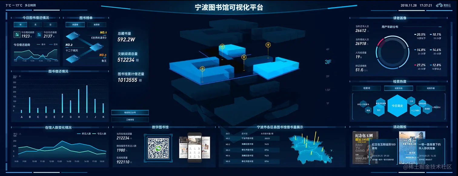 上图所示的动态和交互式的图书馆数据可视化大屏,可显示图书馆的实时用户和访问者的行为,并基于页面跳动的KPI提出了大量指标率,从而制作出全面的数据分析报告,用户可以与之交互并进行调整。