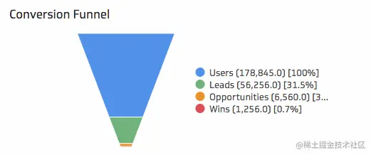 如果要显示一系列步骤以及每个步骤的完成率,漏斗图是我们首选的数据可视化形式;可用于跟踪一系列页面或步骤的销售过程,营销渠道或转化率。