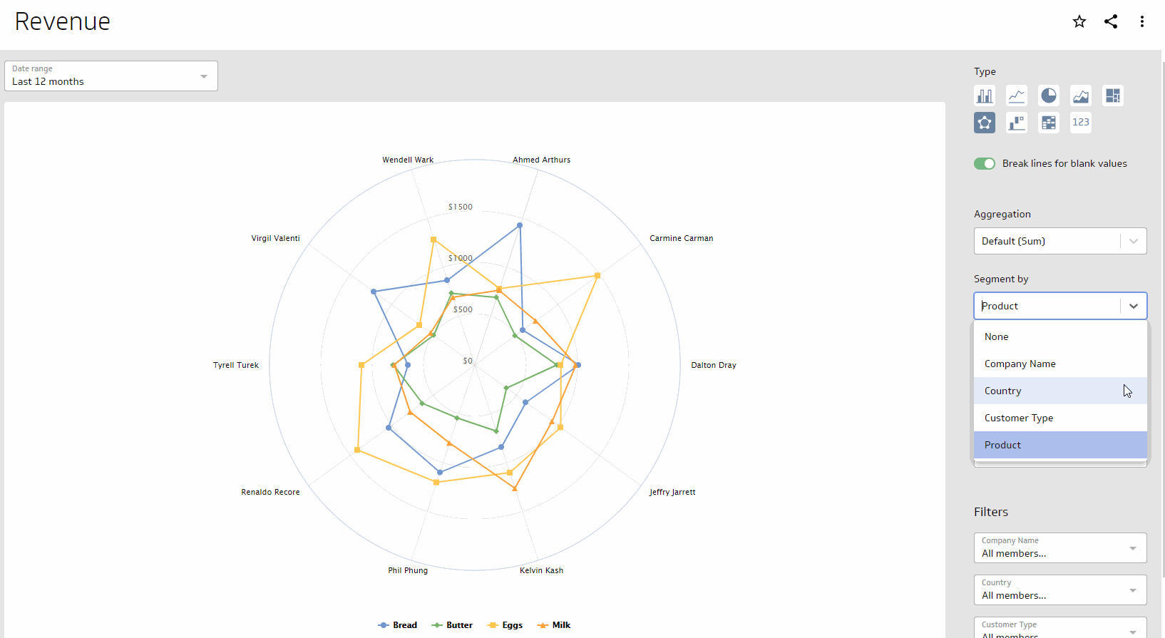 雷达图对于了解数据项之间的相对差异很有用。雷达图使你可以轻松比较多个项目,并查看是否存在可能值得进一步研究的差异。