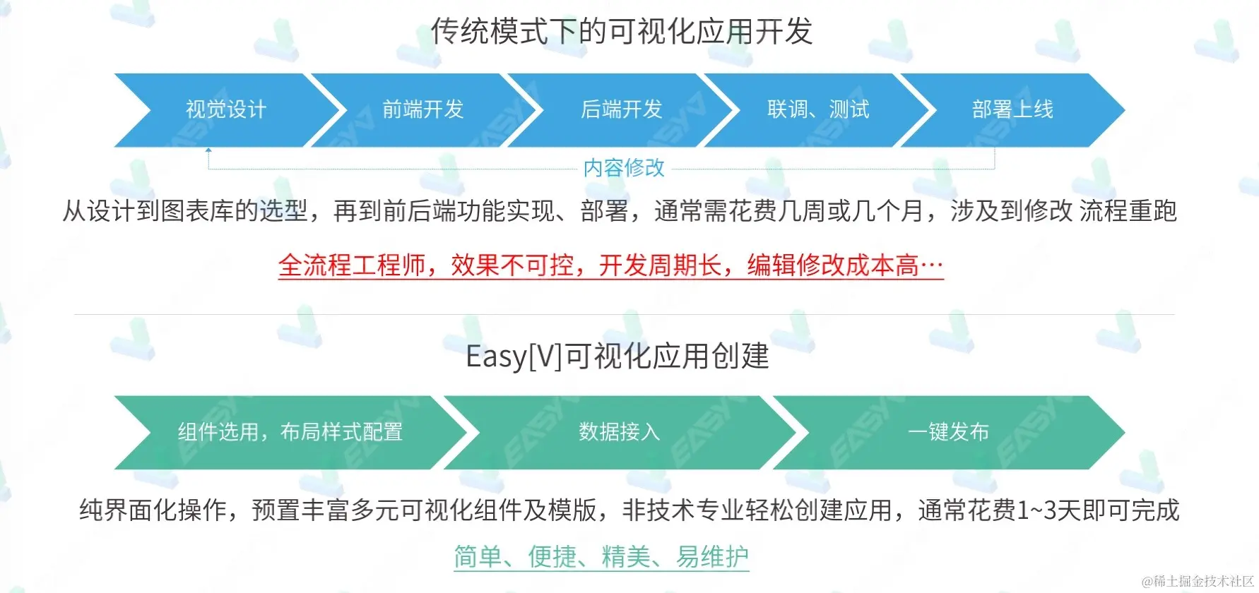 过去数据可视化大屏的开发过程过于繁杂,从前期调研到设计到开发到适配测试最终上线整个流程十分的繁琐以及漫长。而随着数据可视化市场的逐渐成长,很多企业也顺应时代潮流,市场需求,推出了功能强大的SaaS数据可视化平台工具。我们可以看下图,过去数据可视化的开发模式和SaaS平台的制作过程对比。
