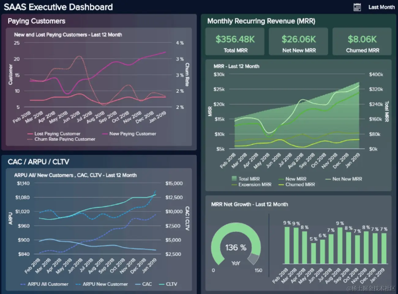 客户生命周期价值是典型SaaS数据大屏分析中最不可或缺的元素之一,因为它可以清楚地表明你在和客户交流关系期间可以从普通客户那里获得多少收入。