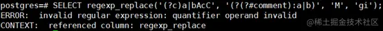 RE以***:开头,则剩余的RE被当作一个ARE。(在GaussDB(DWS)中,这通常没有作用,因为RE被假定为ARE;但是,如果正则表达式函数的flags参数指定了ERE或BRE模式,那么它就会起作用。)