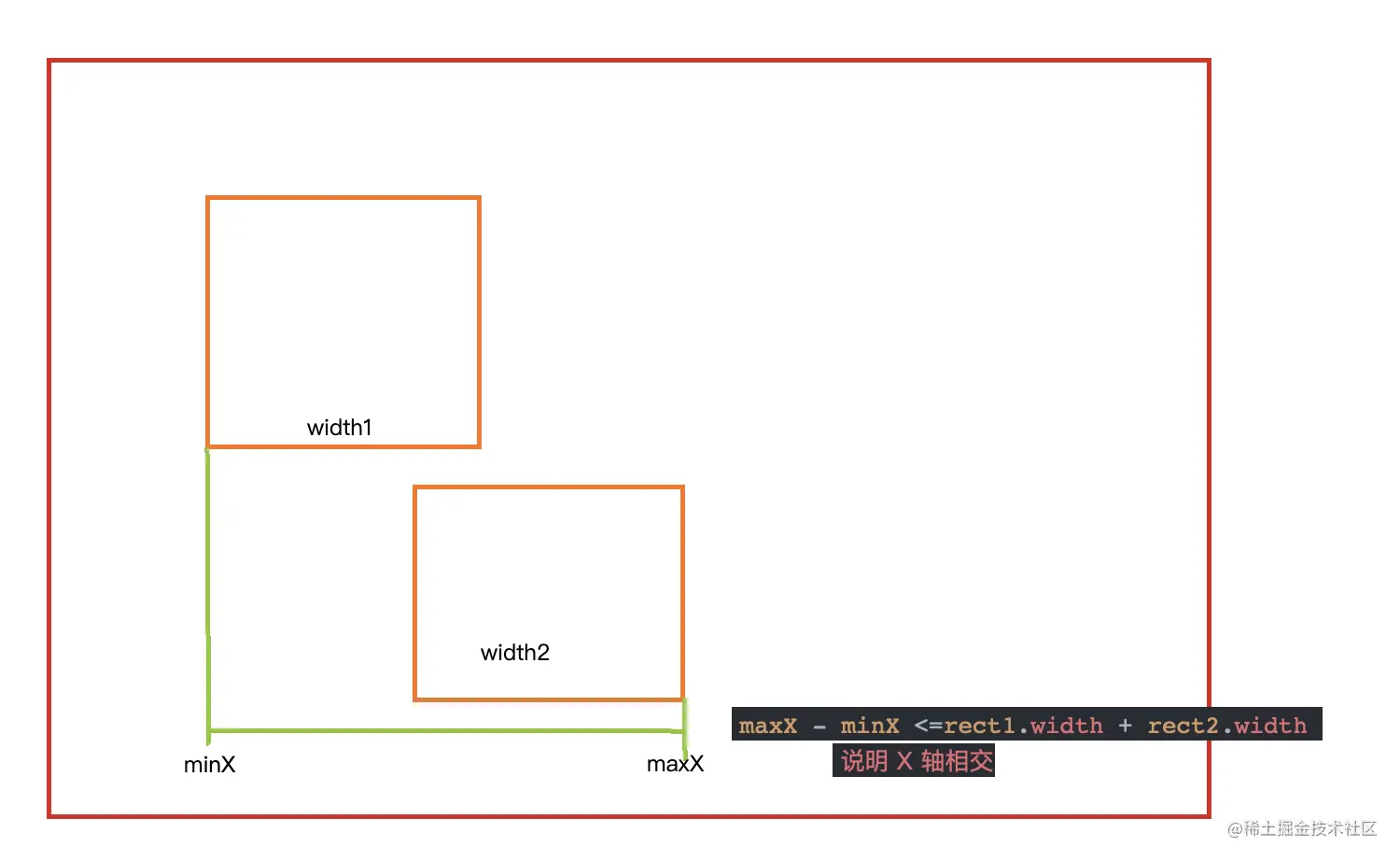 return maxX - minX <= rect1.width + rect2.width && maxY - minY <= rect1.height + rect2.height