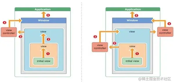 在视图层次结构的最顶层视图也不能处理接收到的事件或消息,则将事件或消息传递给UIWindow对象进行处理