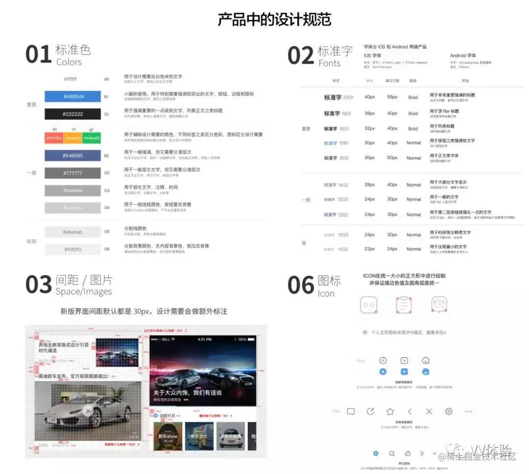 设计规范涵盖范围很广,字体、动效、交互、色彩、控件、间距、图标、列表、弹出层、文案语气、调性等等模块。