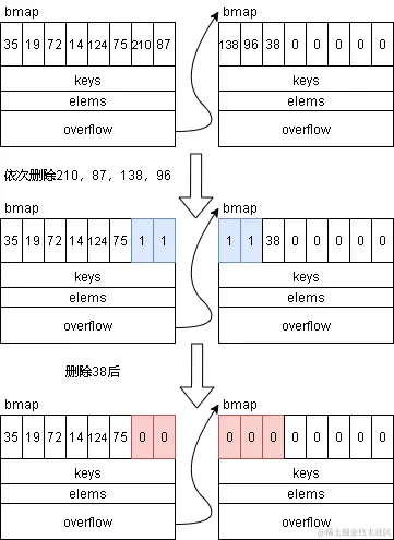 3.在插入时,如果出现过空洞(删除导致),go更倾向往前插入来使得结构更紧凑,而php是顺序插入,在扩容阶段来处理空洞。