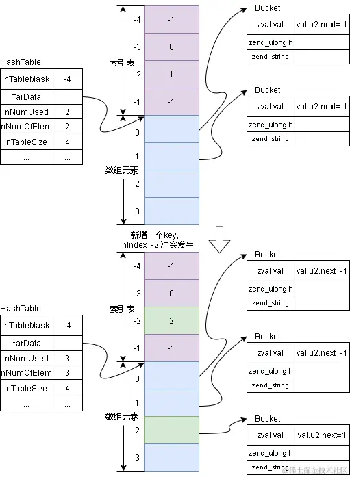 数组元素表顺序插入,更新索引表对应位置数据。值得注意的是,php中并没有对hash冲突进行特殊处理,而是每个key插入数组中的Bucket时,都让其val.u2.next为当前索引表中的值,然后再更新索引表中的值。这样如果没有冲突产生,则val.u2.next值就为-1。无需特殊处理。