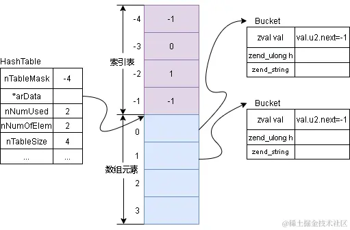 1.数组元素表,每个数组内都是一个Buckets。容量为2^n,插入元素时顺序插入,新插入的元素索引idx为ht->nNumUsed++,nNumUsed是递增的,表示已使用的Buckets数量。