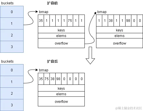 2.增量搬迁:搬迁家族函数为evacuate*,在赋值和删除时,定位到key所属的bucket,则对该bucket内的bmap及其overflow的bmap进行搬迁。