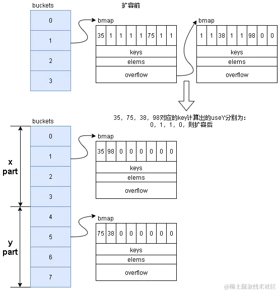 3.如果是双倍扩容,则会分为高和低两部分(两部分容量相等),并使用两个exacDst:y和x分别对应高位和低位。计算落到高位还是低位。