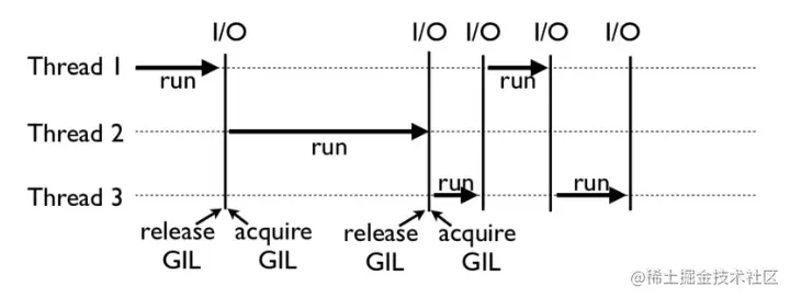 - 计算密集和I/O密集共存的程序中,GIL致使I/O密集的线程饿死,因为没有机会从CPU绑定的线程中获取GIL。所以Python内置了一种机制,强制线程在固定间隔后释放GIL,并且如果没有其他人获得GIL,则相同的线程才可以继续使用它。