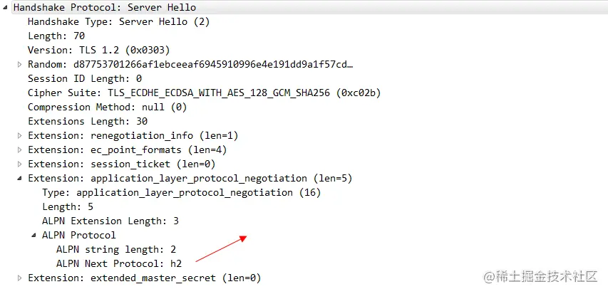 其中这个alpn协议的信息 就代表客户端可以接受哪两种协议。server hello 这个消息 就明确的告知 我们要使用H2协议。