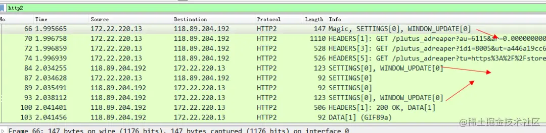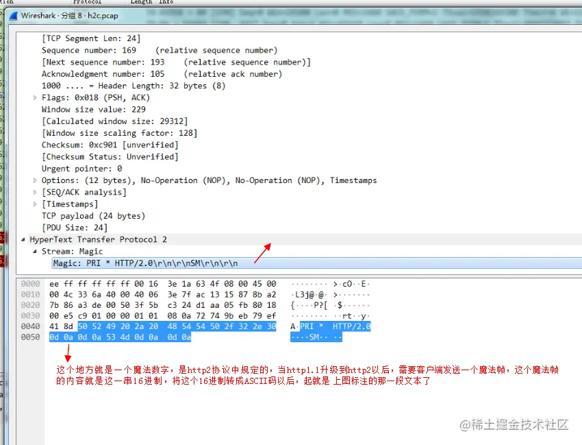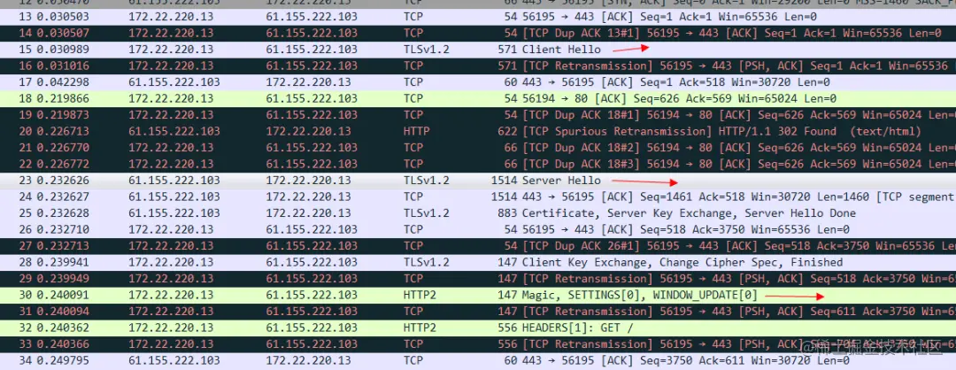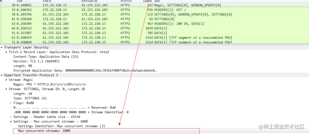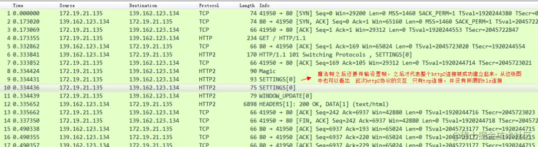 我们将TCPDump出来的pcap文件拷贝到本地,然后用Wireshark打开以后还原一下整个HTTP 2连接建立的报文: