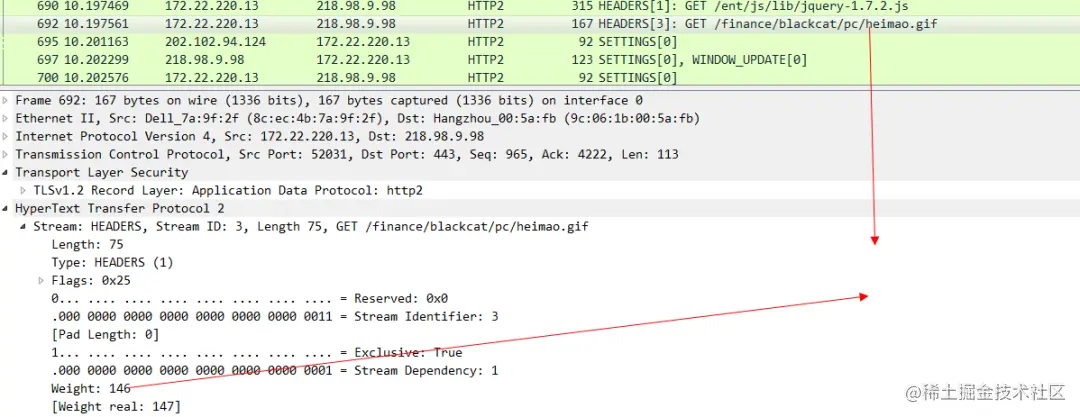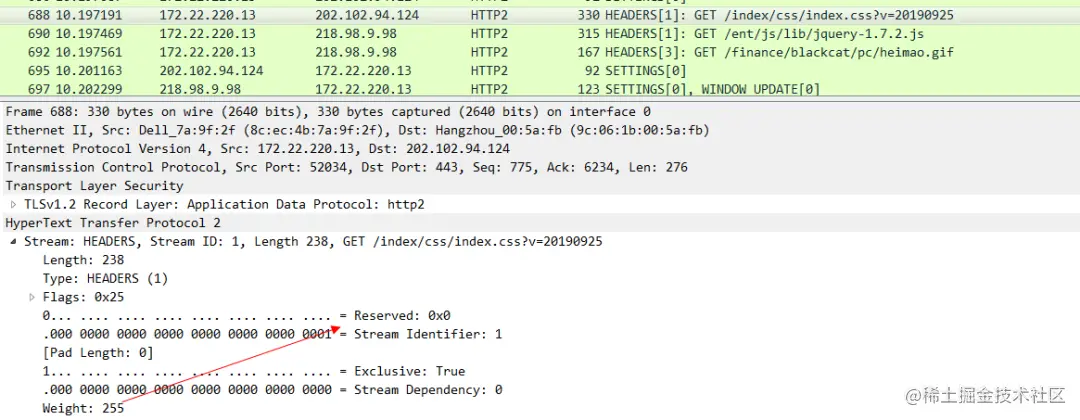 可以看出来这个CSS文件 就是我们主动push过来的。再看下Wireshark。