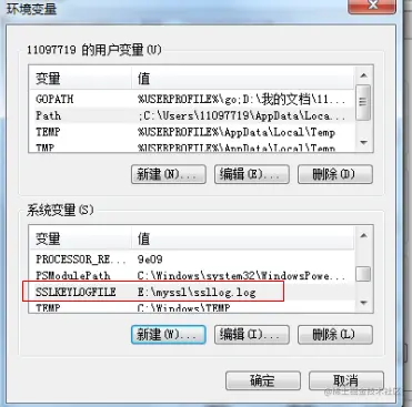 将Chrome浏览器的TLS/SSL之类的信息 输出到一个日志文件中,需要额外配置系统变量,如图所示: