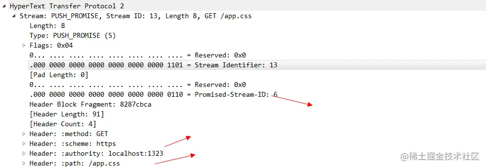 可以看出来 stream id为13的 是客户端发起的请求,因为id是单数的,在这个stream中,还存在着push_promise帧,这个帧就是由服务器发送给浏览器的,看一下他的具体内容。