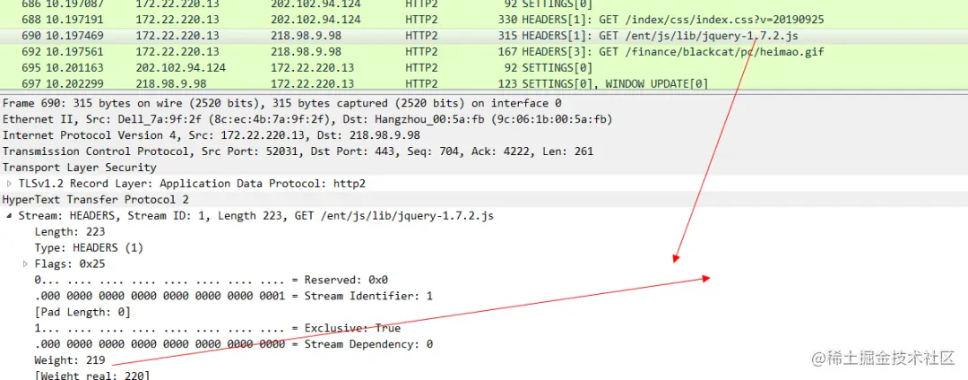 聪明如你一定能想到,既然HTTP 2都能做到流控了,那一定也可以来做优先级。比方说在HTTP 1.x协议中,我们访问一个Html页面,里面会有JS和CSS还有图片等资源,我们同时发送这些请求,但是这些请求并没有优先级的概念,谁先出去谁先回来都是未知的(因为你也不知道这些CSS和JS请求是不是在同一条TCP连接上,既然是分散在不同的TCP中,那么哪个快哪个慢是不确定的),但是从用户体验的角度来说,肯定CSS的优先级最高,然后是JS,最后才是图片,这样就可以大大缩小浏览器白屏的时间。在HTTP 2中 实现了这样的能力。比如我们访问sina的站点,然后抓包就可以看到: