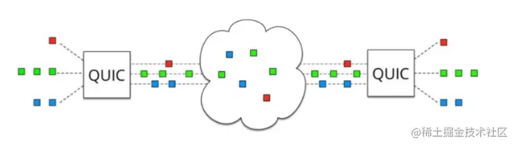 基于TCP或者TCP+TLS的 HTTP 2协议 还是遇到了很多问题,比如:握手时间过长问题,如果是基于TCP的HTTP 2协议,那么至少要三次握手,如果是TCP+TLS的HTTP 2协议,除了TCP的握手还要经历TLS的多次握手(TLS1.3已经可以做到只有1次握手)。每一次握手都需要发送一个报文然后接收到这个报文的ack才可以进行下一次握手,在弱网环境下可以想象的到这个连接建立的效率是极低的。此外,TCP协议天生的队头拥塞 问题也一直在困扰着HTTP 21.x协议和HTTP 2协议。我们看一下谷歌spdy的宣传图,可以更加精准的理解这个拥塞的本质: