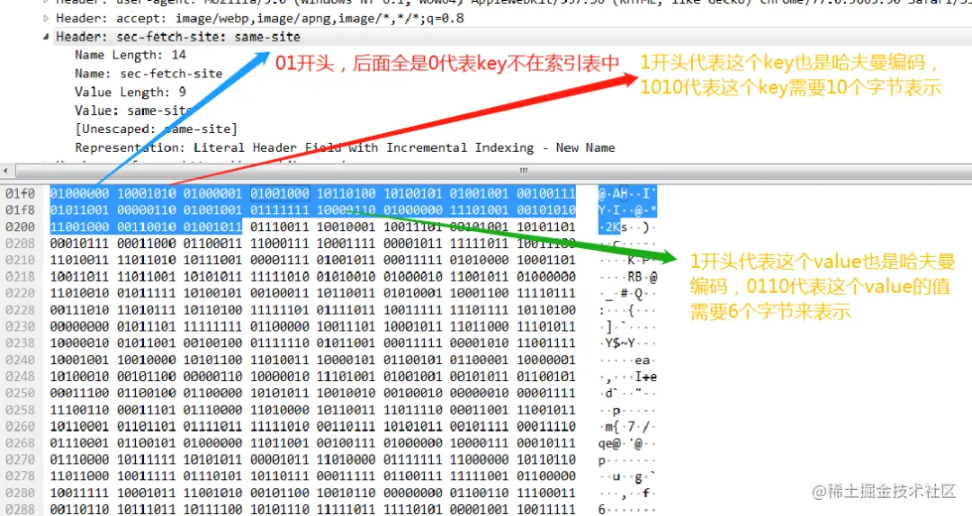 对于key在索引表中,value 不在索引表中的情况,固定是01开头的字节,后面6个bit(111010 换算成十进制就是58)就是静态索引的值, user-agent在索引中index的值是58 再加上01开头的2个bit 换算成二进制就是01111010,16进制就7a了。然后接着看第二个字节,0xd4,0xd4换算成二进制就是 1 101 0100,其中第一个bit 代表后面采用的是哈夫曼编码,后面的7个bit 这个key-value的value 需要几个字节来表示,这里是101 0100 换算成10进制就是84,也就是说这个user-agent后面的value需要84个字节来表示,我们数一下图中的字节数 16*5+第一排d4后面的4个字节,刚好等于84个字节。