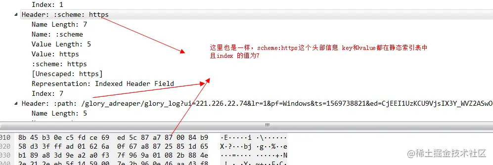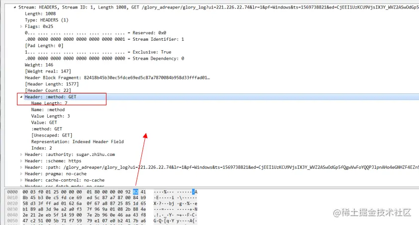 例如这个header帧,注意看这个method:get的头部信息。因为method:get 在静态索引表中的索引值为2.对于这种key和value都在索引表中的值,我们用一个字节也就是8个bit来标识,其中第一个bit固定为1,剩下7位就用来表示索引表中的值,这里method:get 索引表的值为2,所以这个值就是1000 0010,换算成16进制就是0x82.