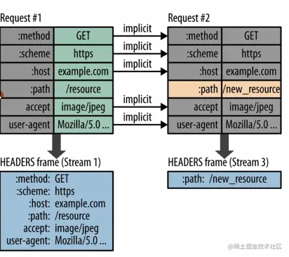 也是一样的,多个请求连续发送的时候,多数情况下变化的只有path,其余头部信息是不变的,那么基于此场景,最终传输的时候也就只有path这一个头部信息了。
