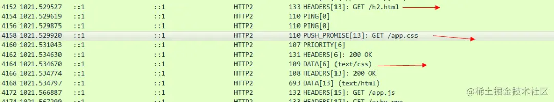 可以看出来这个帧就是用来告诉浏览器,我主动push给你的是哪个资源,这个资源的stream-id 是6.图中我们也看到了有一个stream-id 为6的 data在传输了,这个就是服务器主动push出来的CSS文件。到这里,一次完整的Server Push就交互完毕了。