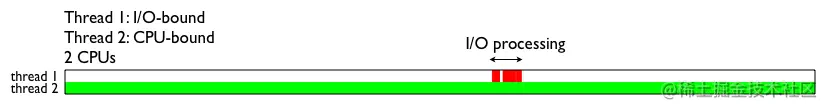 - 绿色区域指示线程何时保持GIL并正在运行。