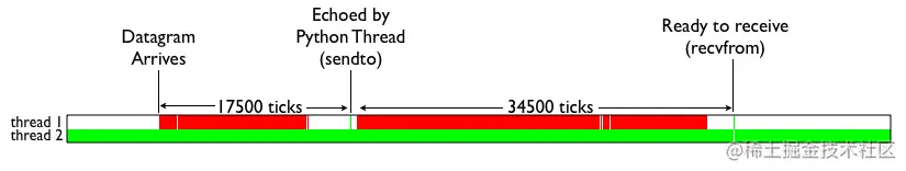 在UDP消息的到达与s.recvfrom()调用的成功返回之间传递了大约17000个解释器滴答声(并注意所有GIL争用)