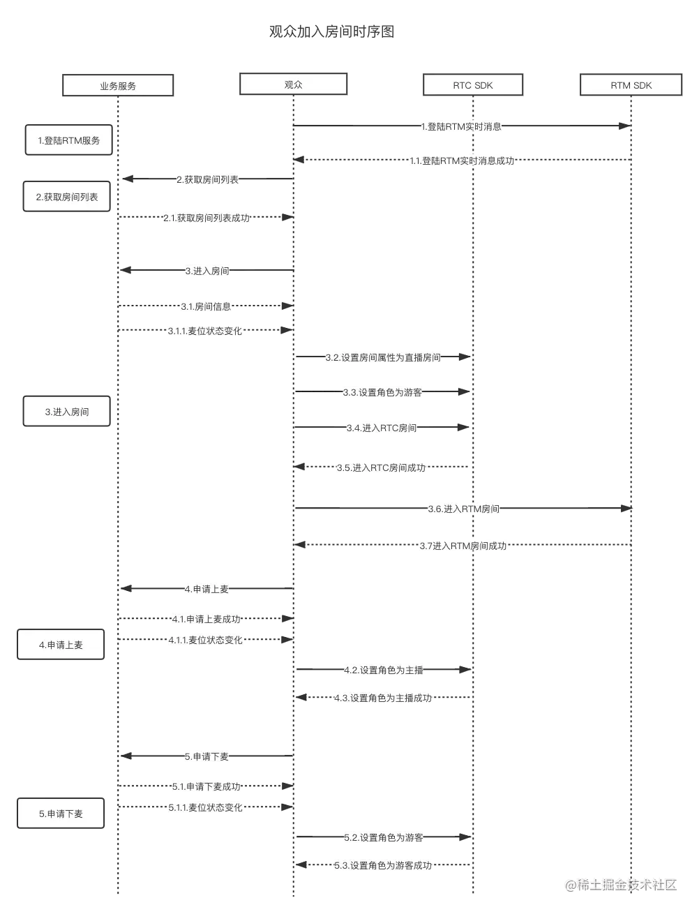 - 游客向业务服务请求上麦,有服务端给予一个麦位,然后设置角色为主播,完成上麦操作。其他观众以及主播,收到该用户的上麦提示,更新麦序。