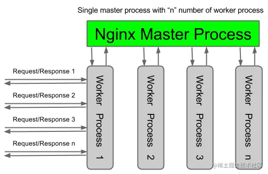 master 进程能监控 worker 进程的运行状态,当 worker 进程退出后(异常情况下),会自动启动新的 worker 进程。一个请求,完全由 worker 进程来处理,而且只能在一个 worker 进程中处理请求。