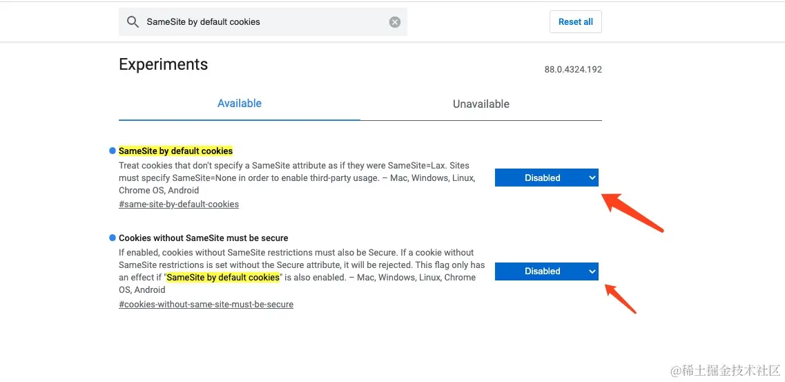chrome 升级后本地环境不可种入 cookie 段月 2021-02-23 213 阅读1分钟 打开chrome 输入 chrome://flags/ 搜索 SameSite by default cookies 找到SameSite by default cookies和Cookies without SameSite must be secure 将上面两项设置为 Disable