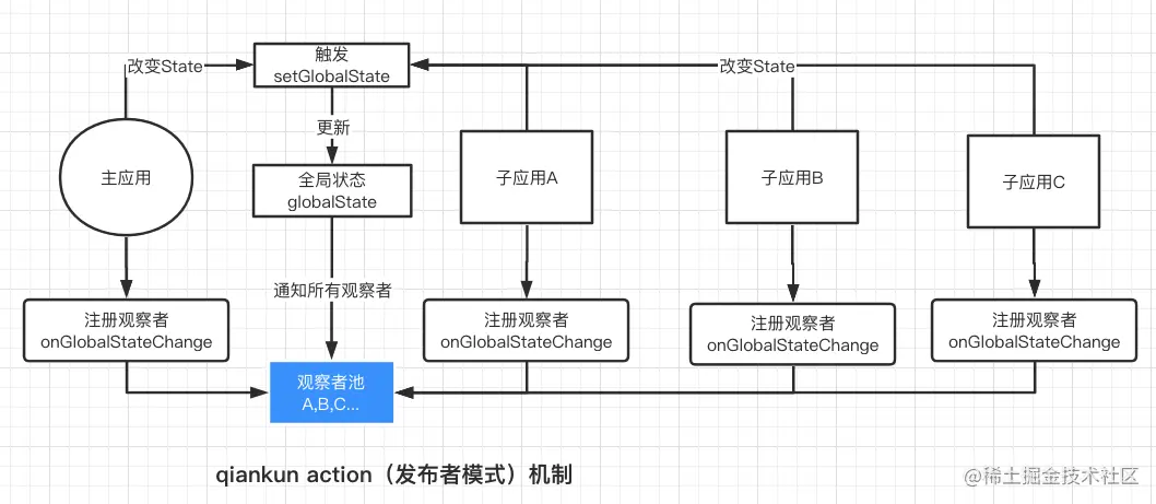- onGlobalStateChange: 注册观察者的函数,子组件通过这个方法注册成观察者,当全局的globalState发生变化,就会触发该函数。