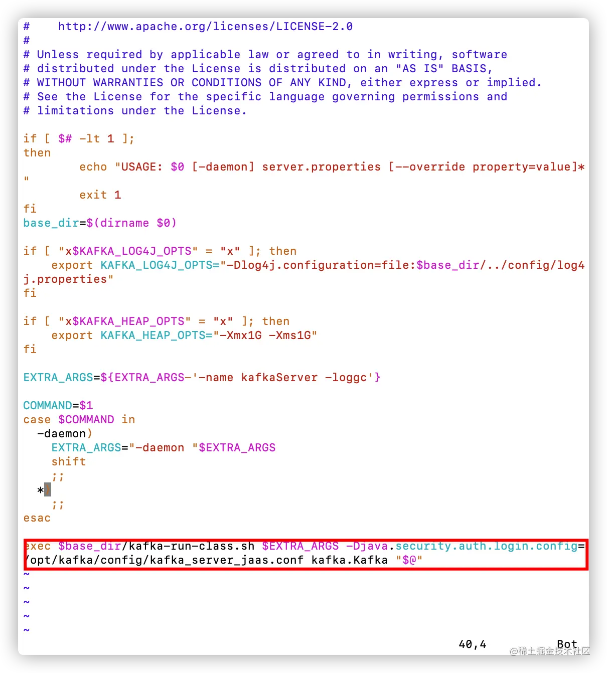 前面我们生成了JAAS文件,要让JAAS生效,我们还有最后一步:在bin目录下找到kafka-server-start.sh文件在java运行代码参数部分添加上-Djava.security.auth.login.config=/opt/kafka/config/kafka_server_jaas.conf, 如下图所示: