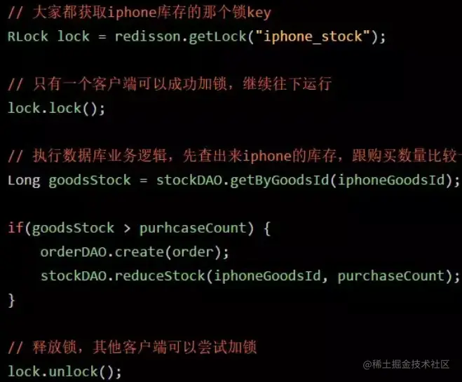 从上面逻辑代码可以看出,只有一个订单系统实例可以成功加分布式锁,然后只有他一个实例可以查库存、判断库存是否充足、下单扣减库存,接着释放锁。释放锁之后,另外一个订单系统实例才能加锁,接着查库存,一下发现库存只有2台了,库存不足,无法购买,下单失败。不会将库存扣减为-8的。