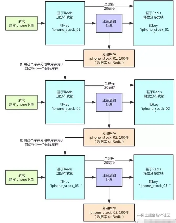 其实这就是分段加锁。你想,假如你现在iphone有1000个库存,那么你完全可以给拆成20个库存段,要是你愿意,可以在数据库的表里建20个库存字段,比如stock_01,stock_02,类似这样的,也可以在redis之类的地方放20个库存key。