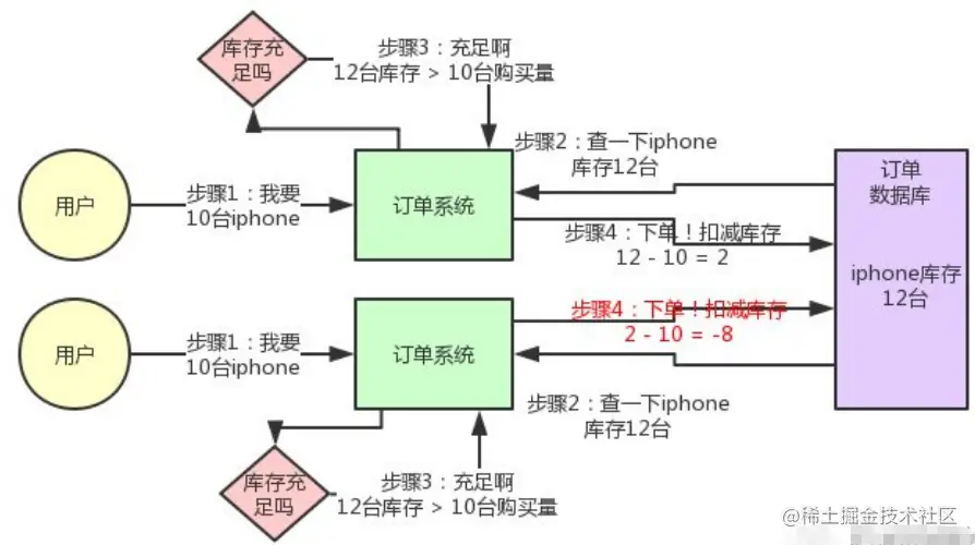 这个图,其实很清晰了,假设订单系统部署两台机器上,不同的用户都要同时买10台iphone,分别发了一个请求给订单系统。接着每个订单系统实例都去数据库里查了一下,当前iphone库存是12台。在不做防库存超卖情况下,两个用户都能下单!于是乎,每个订单系统实例都发送SQL到数据库里下单,然后扣减了10个库存,其中一个将库存从12台扣减为2台,另外一个将库存从2台扣减为-8台。现在完了,库存出现了负数!没有20台iphone发给两个用户啊!。以上场景就好比,大家都在抢一台2匹的COLMO高端空调,超卖情况下,公司亏损严重,程序员背锅。。。