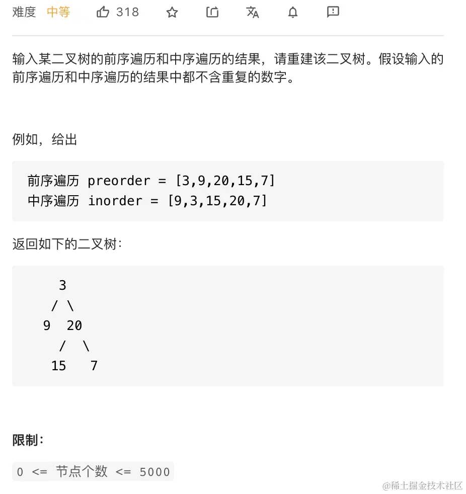 - 划分左右子树: 查找根节点在中序遍历 inorder 中的索引 i ;