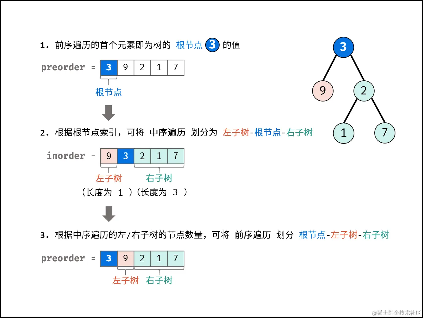 通过以上三步,可确定 三个节点 :1.树的根节点、2.左子树根节点、3.右子树根节点。 对于树的左、右子树,仍可使用以上步骤划分子树的左右子树。