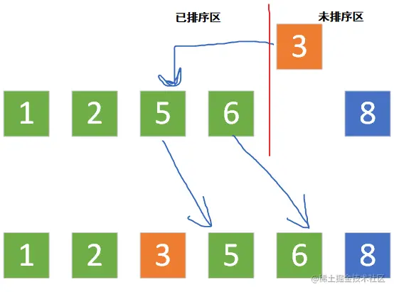 - 插入排序将数组划分为两个区域,已排序区,和未排序区