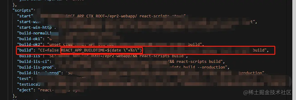 在我以为终于可以摸鱼了,我还是太低估客户的搞事能力,因为项目还在内部迭代期间,发版本还是很频繁,每次更新版本后客户希望能知道当前版本的build的时间和自己最近更新版本的时间,别喷客户,我的客户自己就是开发,他希望看到开发眼里重要的内容,其实这个用版本号来记录是最形象的表达,但是考虑到客户不会提供版本号管理功能,那就考虑在package.json里面自己更新version版本,这个方案也被否决了,因为每次更新前都得手动改,容易错乱,还有其他同事再一起做项目,难以管理,最后就提出直接保存每次打包的时间,这个通过设置scripts来实现,如下: