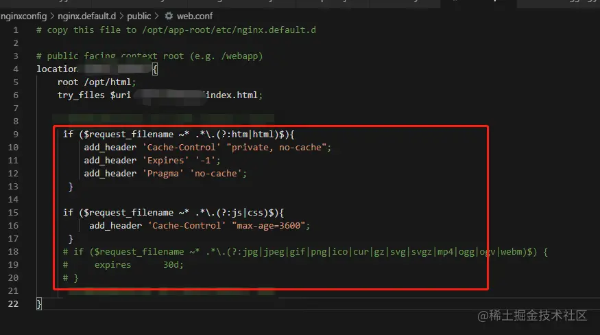 按照上面提到的文章里面对浏览器缓存的介绍,我选择了对html文件不缓存,设置no-cache,注意这里的no-cache不是说不缓存,它还是会去浏览器比对一次,如果html文件没变化就返回304,还是使用旧的html文件,如果改变了就重新下载html文件,对js和css文件设置一个小时的缓存时间,max-age=3600,避免每次刷新都去下载文件,这里不需要担心缓存会影响更新,因为如果项目有改动,webpack打包后会给出新的hash后缀,当浏览器解析到这两个文件时发现路径已经变化了也会重新下载文件,这也是为什么对html设置不缓存的原因,这样就能保证只要有变化就一定会去下载最新的内容,我的项目里面用了nginx代理,所以就只在nginx的配置里面来配置这个缓存策略,图片如下: