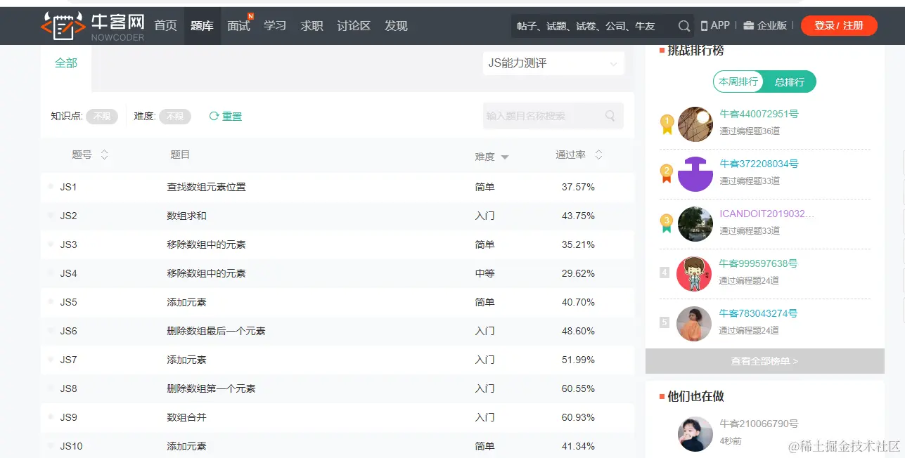 推荐一个练习js的网址 尤雨河youyuhe 2021-02-23 280 阅读1分钟 我曾有一段时间刷leedcode,但是感觉leedcode有点门槛。 用起来不顺手,后来发现许多大厂喜欢用牛客网里面的题面试前端。 于是摸索刷牛客网里面的题。 这是牛客网经典45题的网址,里面有45道js的题目,有答案有讨论。 www.nowcoder.com/ta/js-asses…