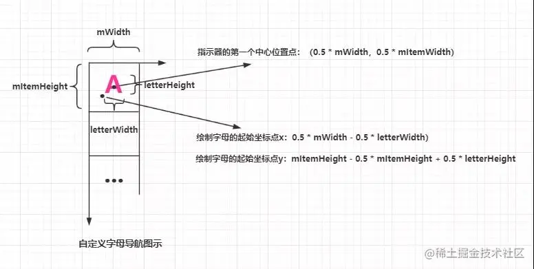 自定义 View 实际上就是在 View 上找到合适的位置,将自定义的元素有序的绘制出来即可,绘制过程最困难的就是如何根据具体需求计算合适的左边,至于绘制都是 API 的调用,只要坐标位置计算好了,自定义 View 绘制这一块应该就没有问题了,下面的图示主要是标注了字母指示器绘制的中心位置坐标的计算以及文字绘制的起点位置计算,绘制过程中要保证文字在指示器中心位置,参考如下: