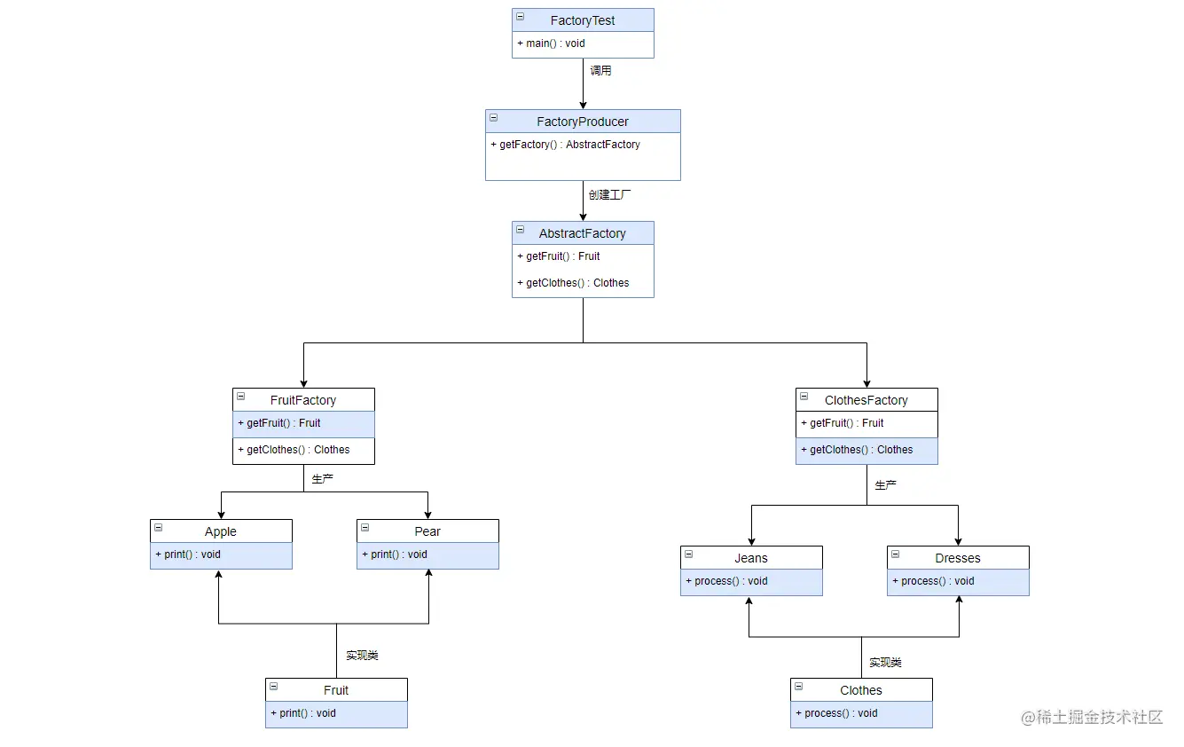 抽象工厂模式,本质上也是工厂模式,也是属于创建型模式,用于创建对象。其特点是用一个超级工厂创建其他的工厂,也就是工厂的工厂。每一个工厂管理一类的产品,比如水果工厂主要负责生产水果产品,服装工厂服装生产服装产品。而每一种工厂本质上都是工厂,都从抽象工厂中衍生出来,只是做了不同的实现。