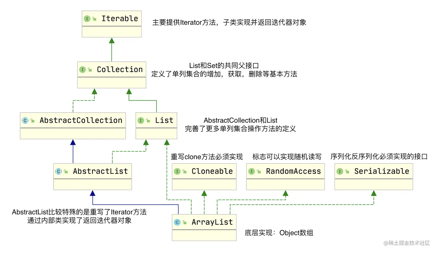 总结: ArrayList底层实现实际是使用了对象数组,所以它是可以实现随机存取的,读取效率高,在指定位置插入和删除元素的效率低(因为需要挪动其他元素),非线程安全,是快速失败的,不可在循环中通过自身的remove方法删除元素,单线程情况下可以使用iterator对象的remove方法删除元素,多线程情况下则需要对迭代器加锁