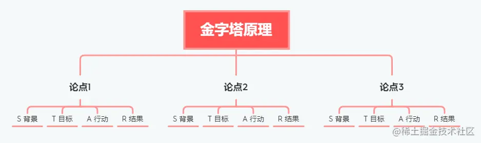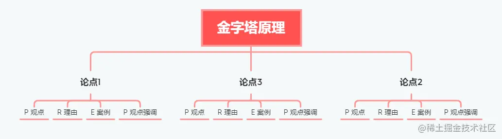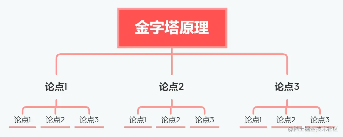 它是思考和表达的一种模式,任何事情都可以提取出一个中心论点,然后拆分为三到七个分论点,每个分论点下面再有三到七个子分论点做支撑,层层向下延伸,状如金字塔。